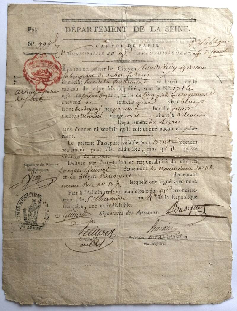 Droit de circuler pour un sabotier allant à Orléans, daté du 23 juillet 1796