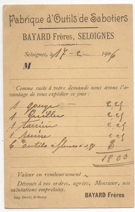 Facture pour outillages de sabotiers daté de 1906